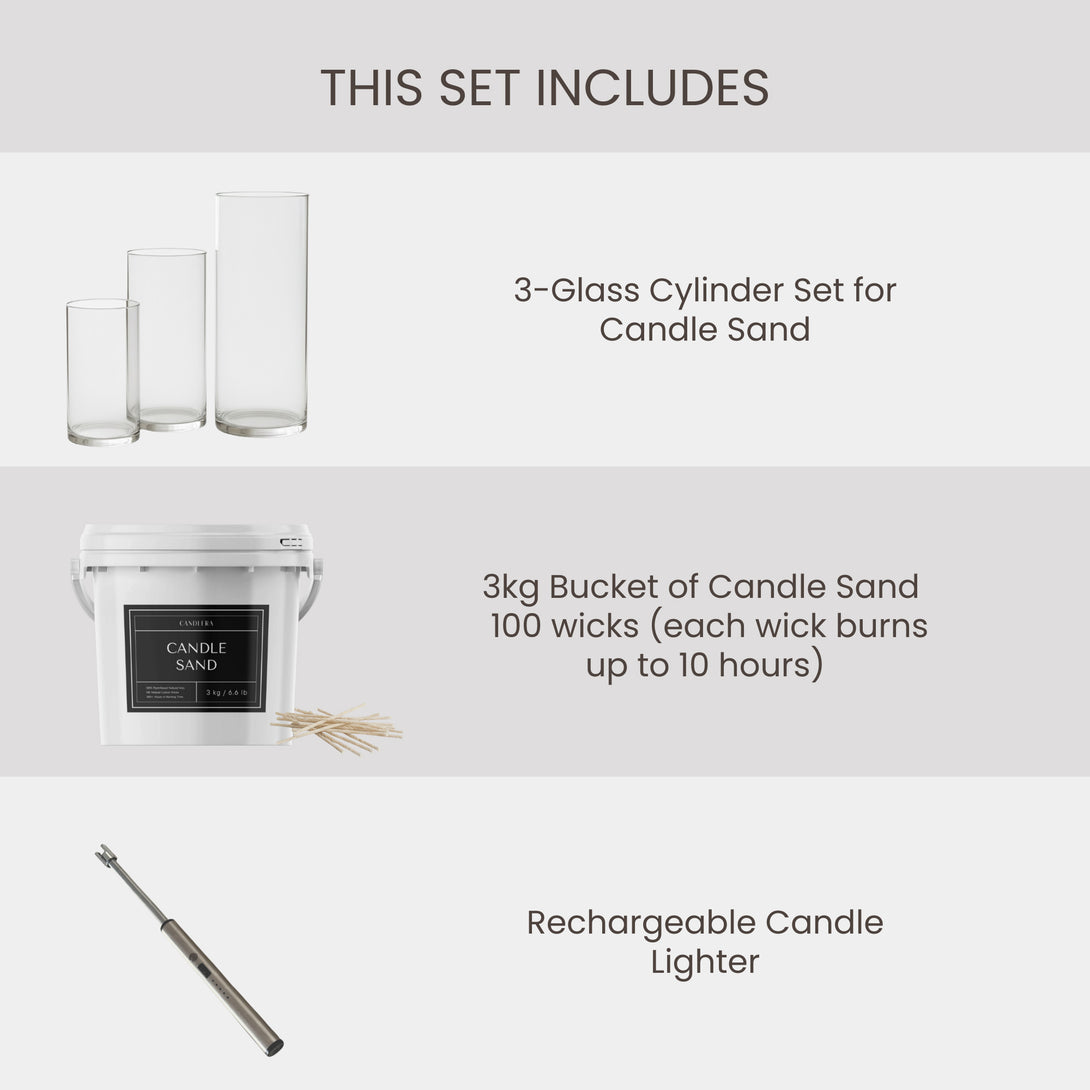 Place the wick into the sand (included in your set), light it, and enjoy the warm, ambient glow.