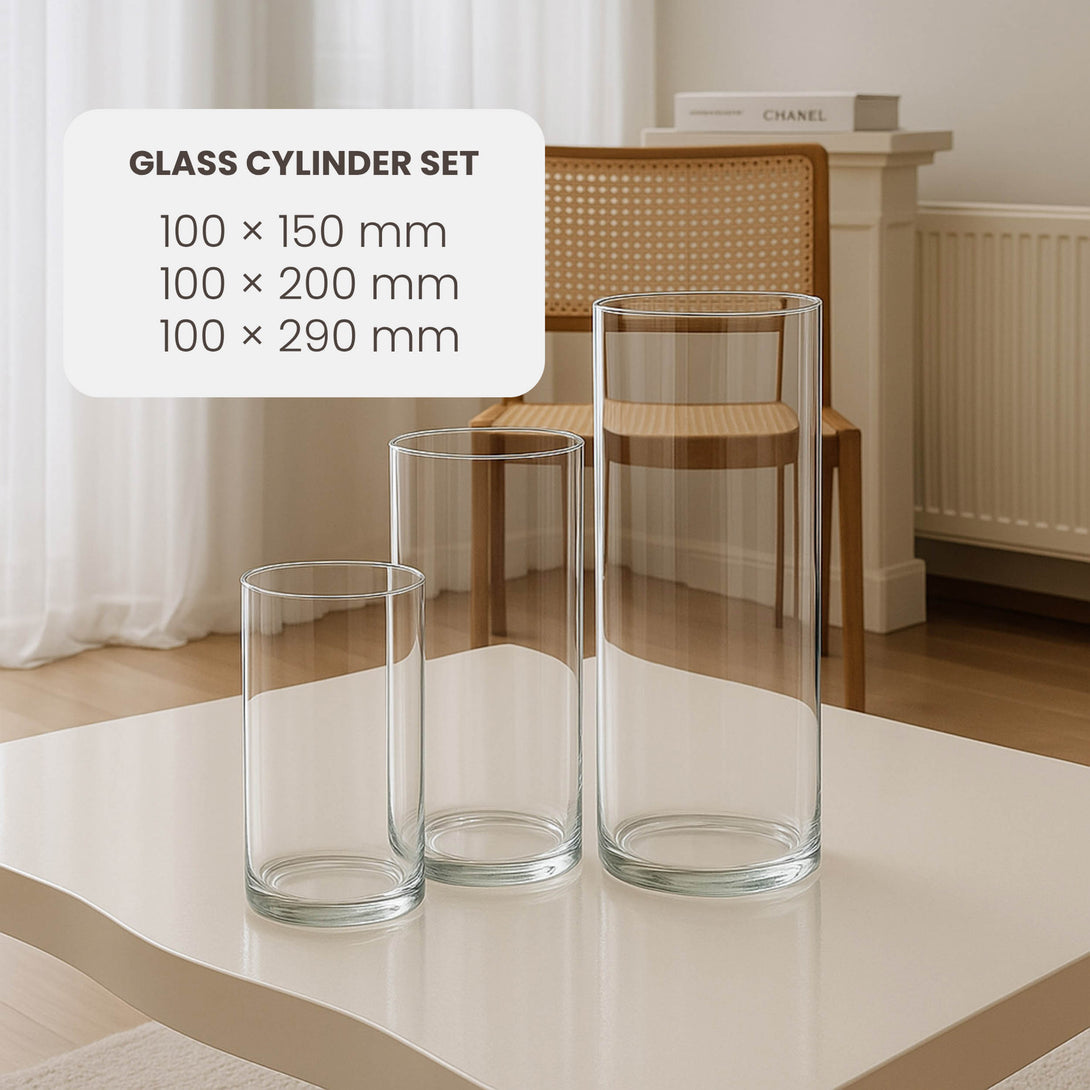 3-Glass Cylinder Set: 100 × 150 mm; 100 × 200 mm; 100 × 290 mm.