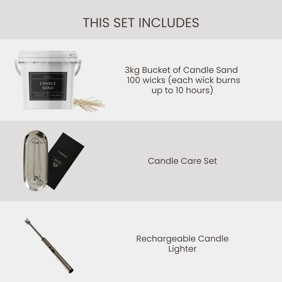 A: Bundles are pre-curated to ensure a balanced mix of products and a limited-edition value. While selection isn’t customizable, every bundle includes our signature Candle Sand and wicks.
