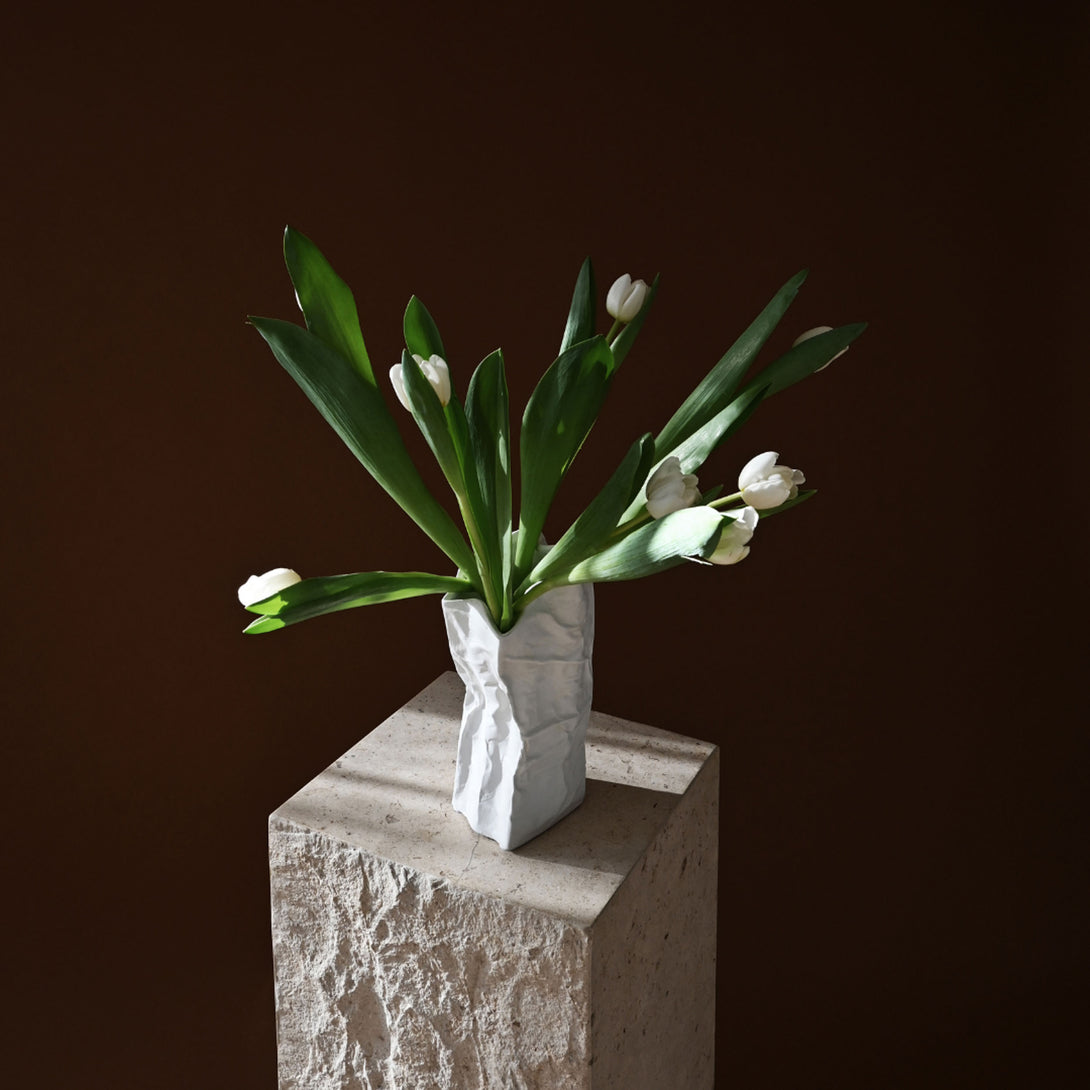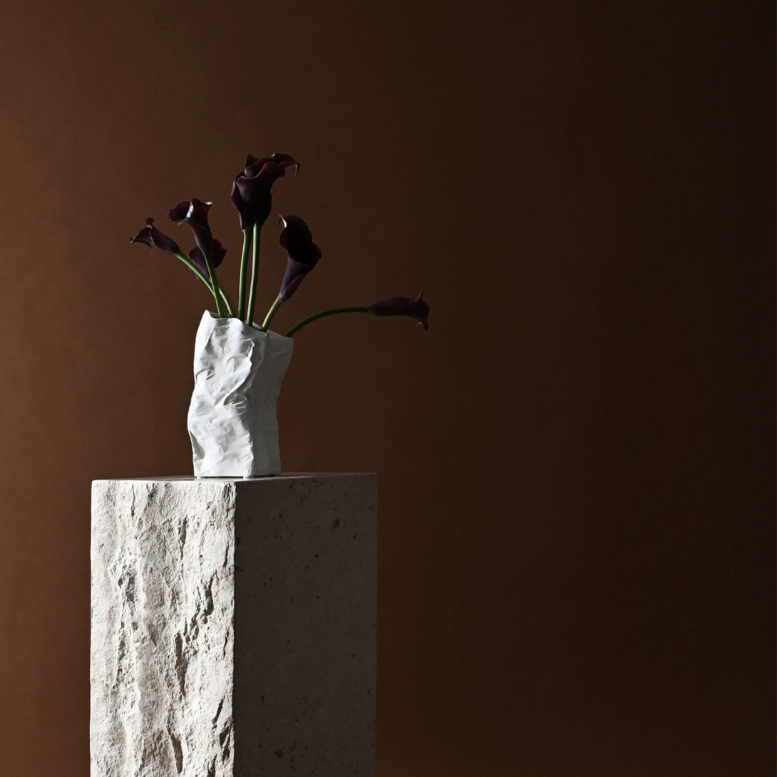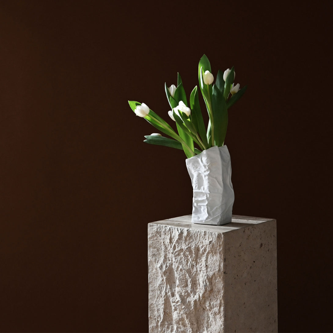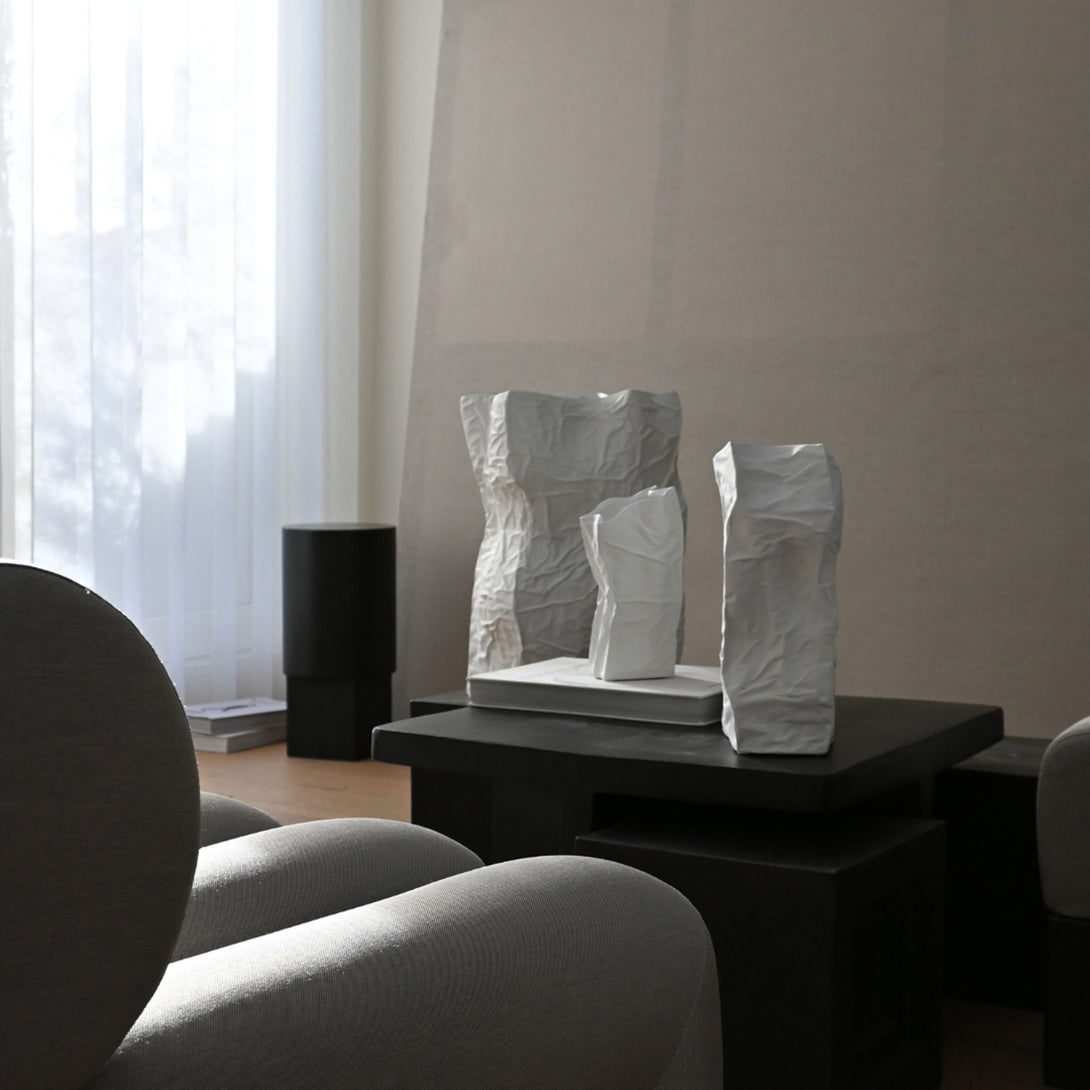 Inspired by the texture of paper bags, the Kami Vase features an organic, uneven surface that mimics crumbled paper. Available in three sizes, it comes in two finishes: Bone White for a natural look and Chrome for a sleek, modern style.