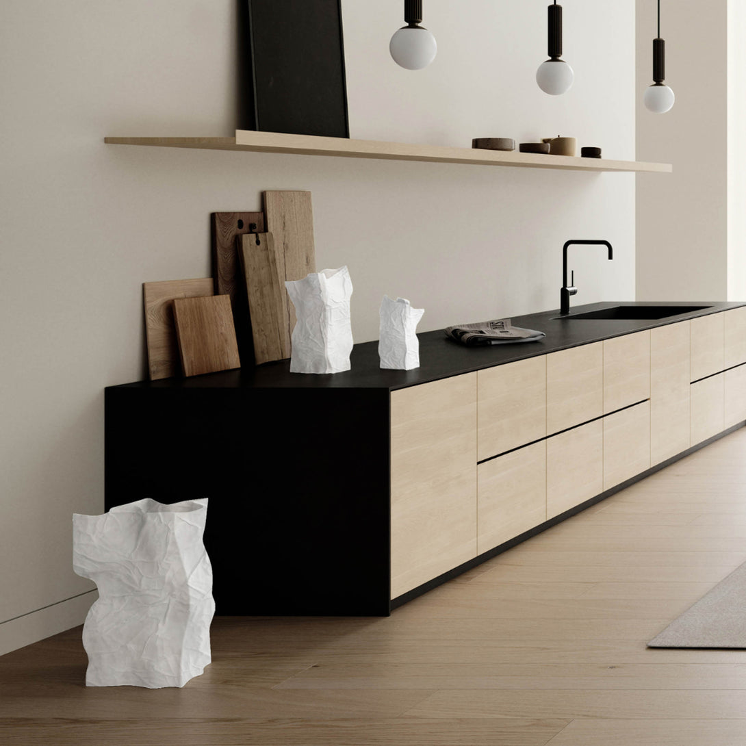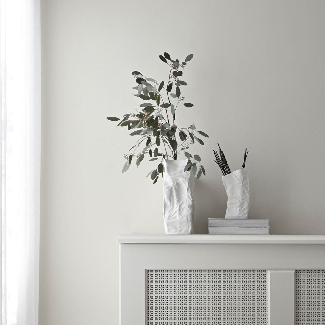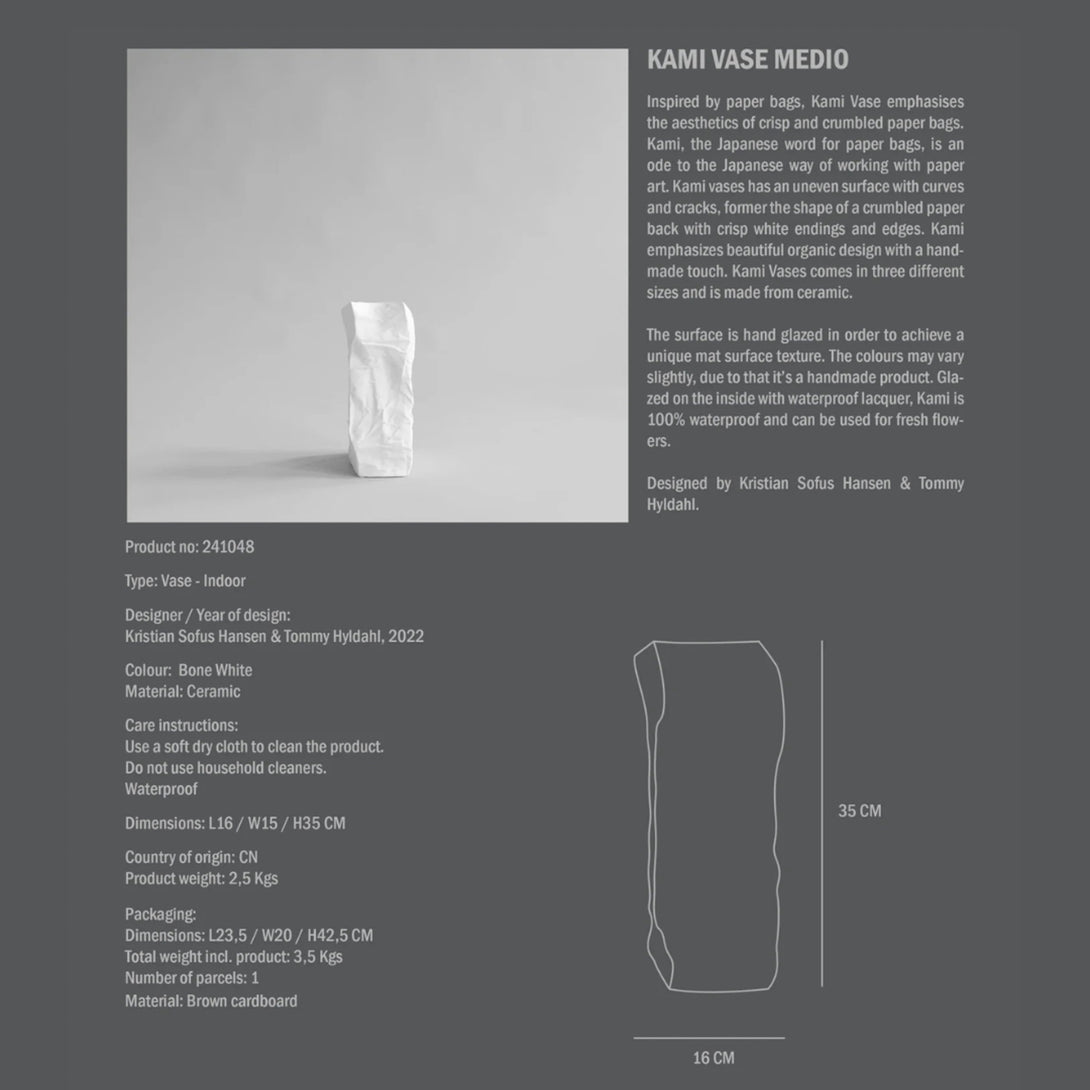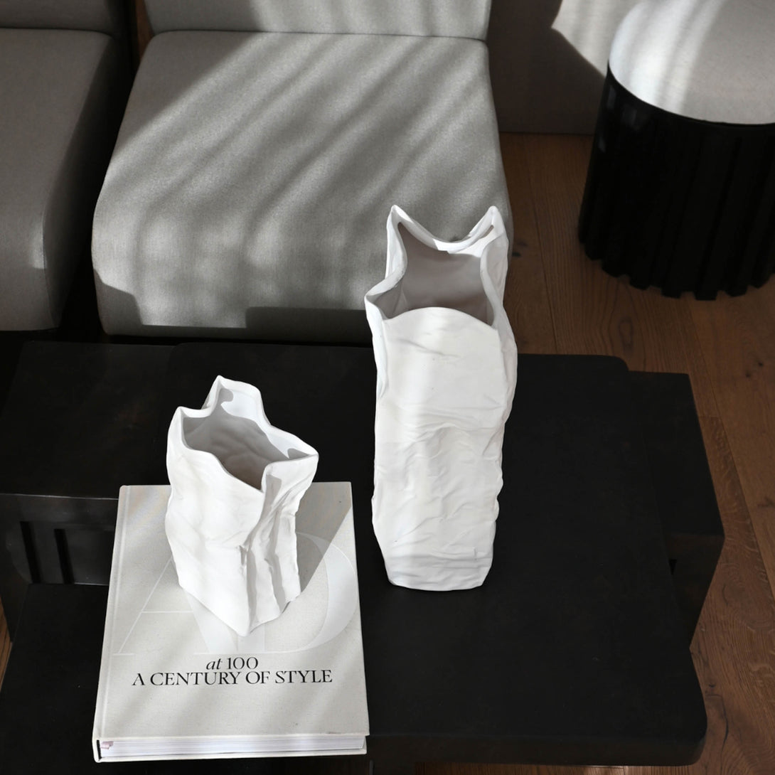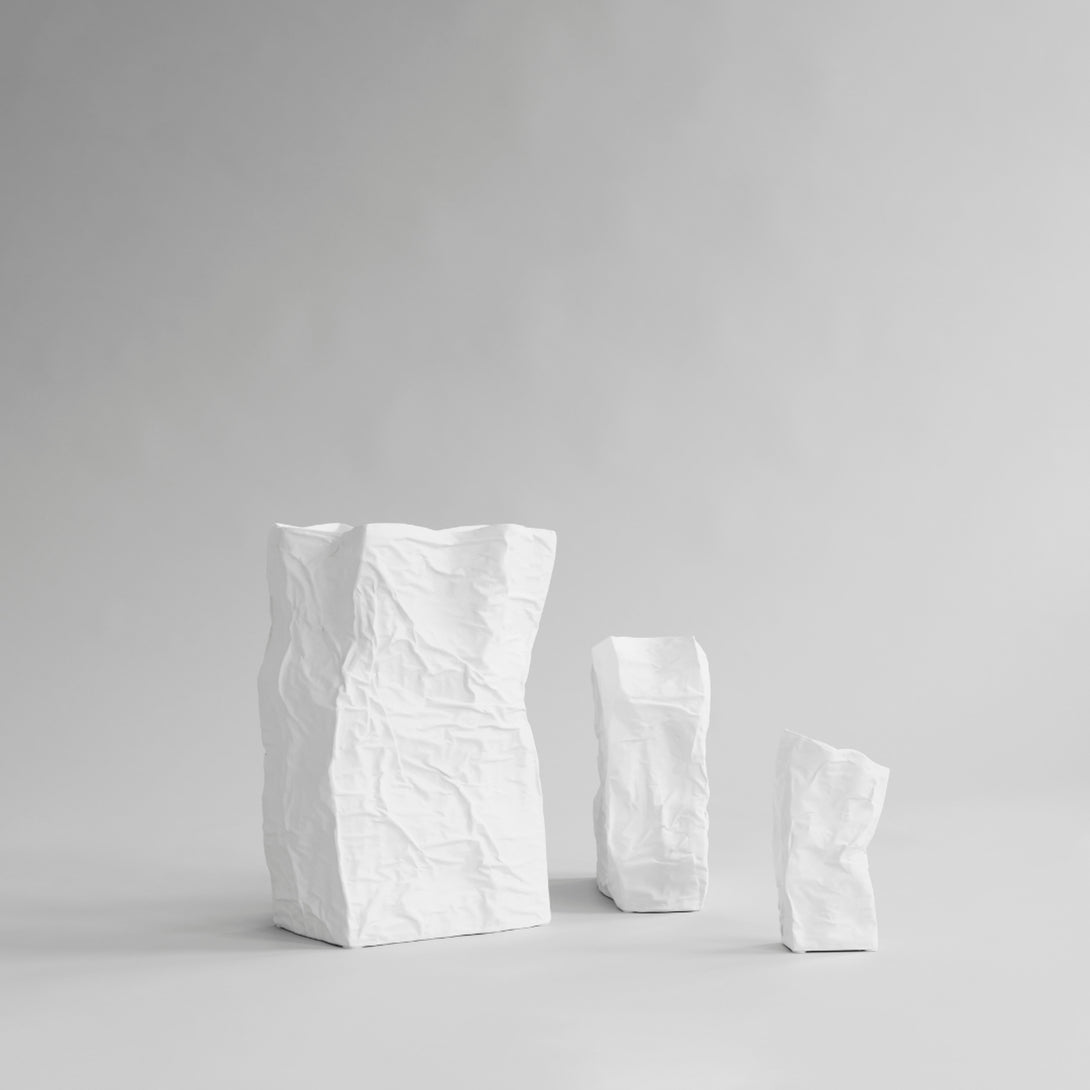 Inspired by the texture of paper bags, the Kami Vase features an organic, uneven surface that mimics crumbled paper. Available in three sizes, it comes in two finishes: Bone White for a natural look and Chrome for a sleek, modern style.