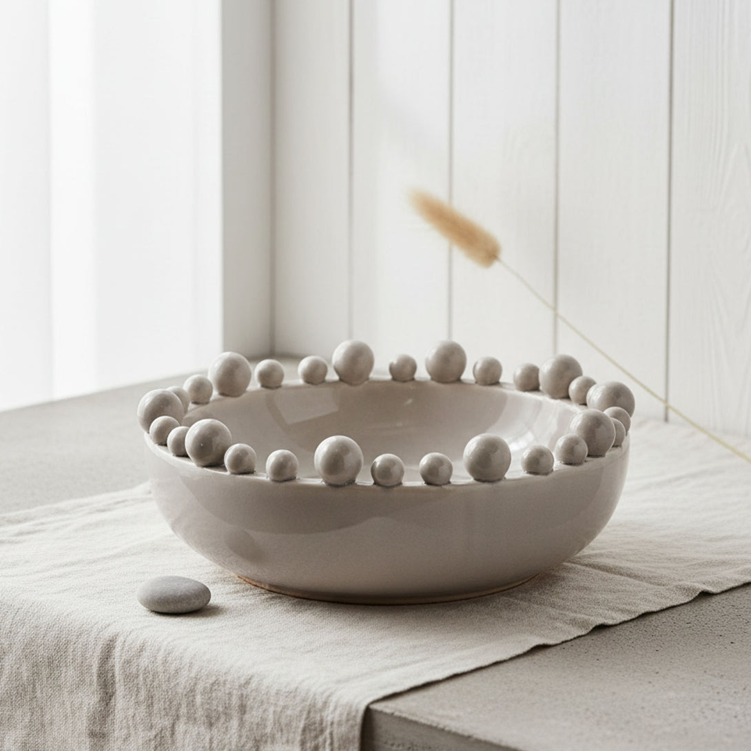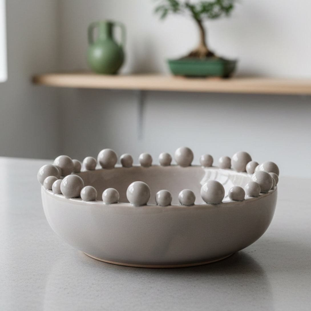 A stunning handmade decorative bowl featuring a unique ball-edge design and a smooth glazed ceramic finish. Its soft beige/grey-green tone and subtle crackled glaze make it a beautiful statement piece for any room.